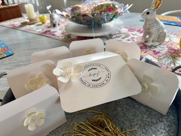 Ballotin box in crisp white, lined with soft padding and finished with your choice of a silver or gold ribbon.